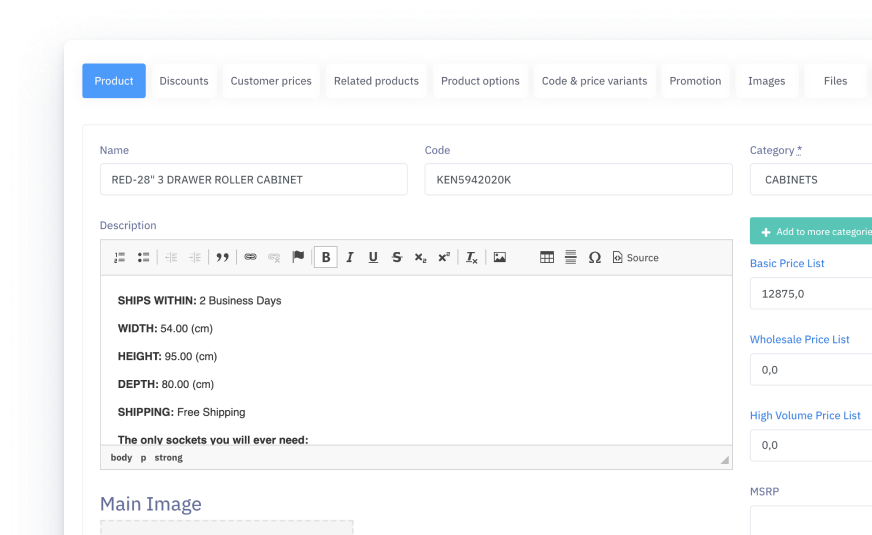 With your B2B Wave-powered B2B eCommerce website, you can customize your product descriptions quickly and easily using text, images, videos, dimensions, SKU codes, and so much more.