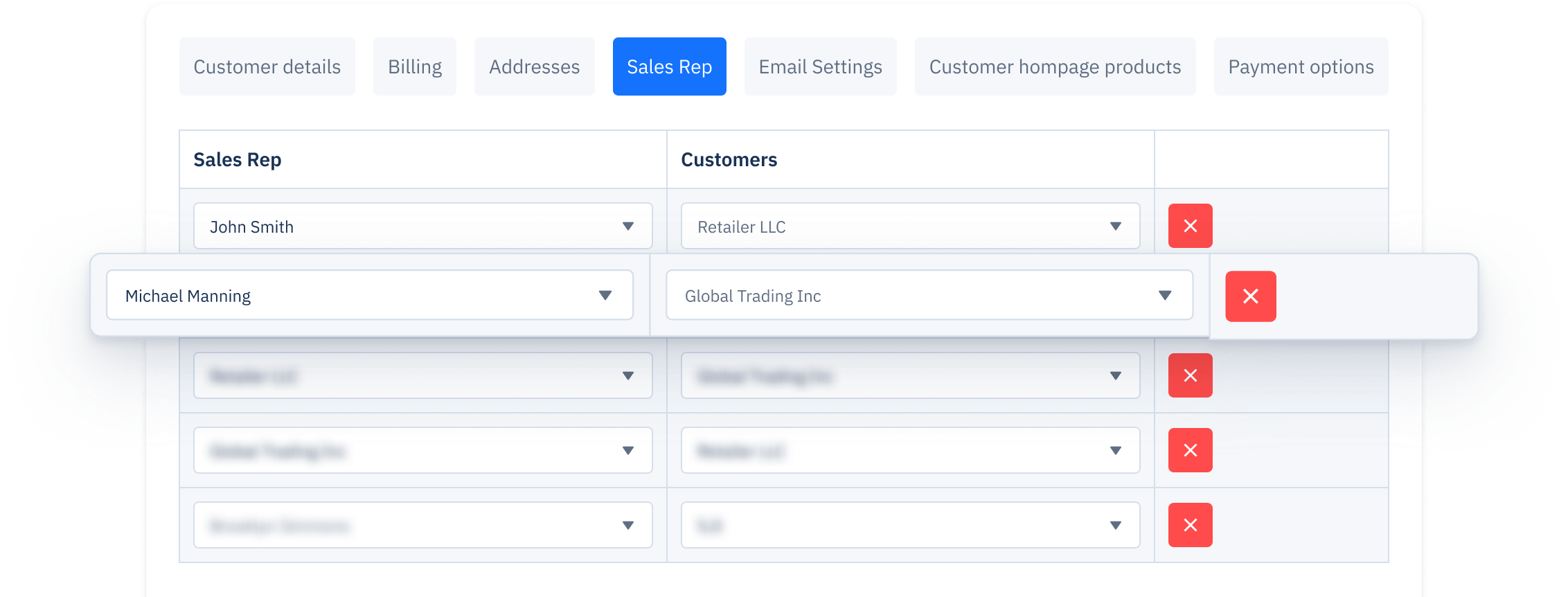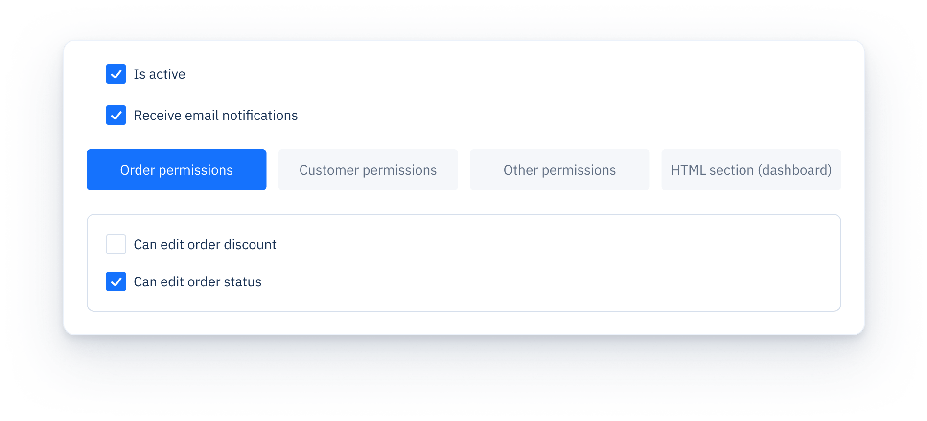 You can choose the actions that are enabled for sales reps when it comes to customers, orders, and more.