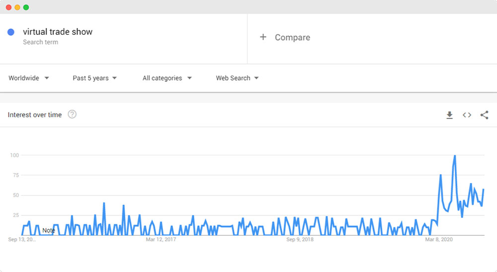 A virtual trade show is an event that’s conducted and hosted online, where exhibitors and visitors can connect with one another on the web rather than in-person. A previously little-known phrase, the popularity of the term ‘virtual trade show’ exploded during the COVID-19 lockdowns. Take a look at the graph below from Google Trends that clearly shows how the term was quite stable for the past five years but then exploded since March 2020.